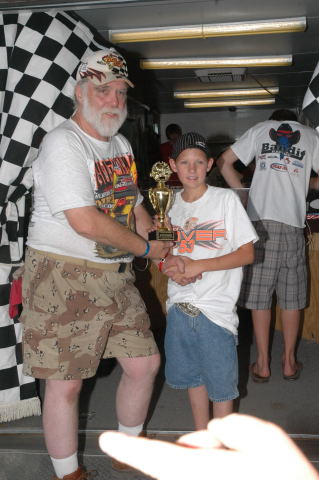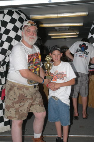 The JR A-Main event winner is presented the trophy from Big Daddy Race Center's Steve Fuller. |