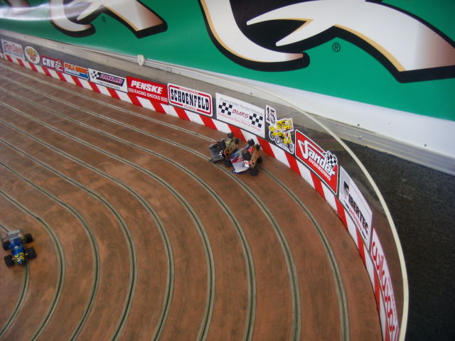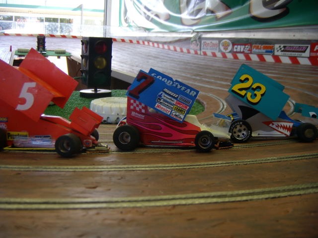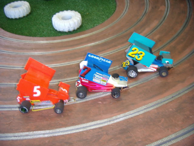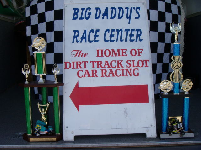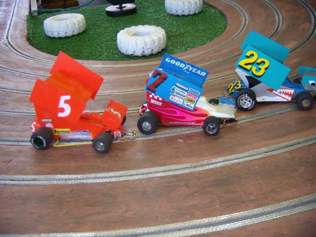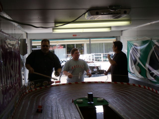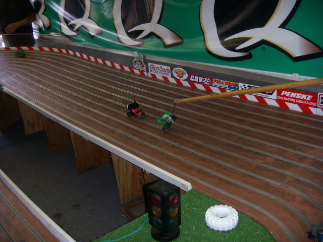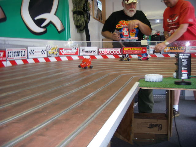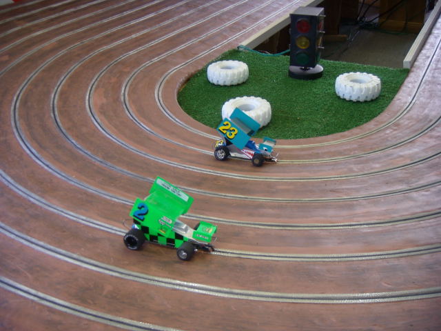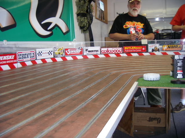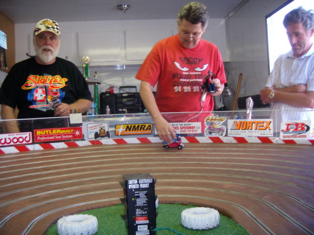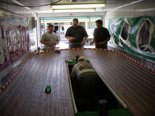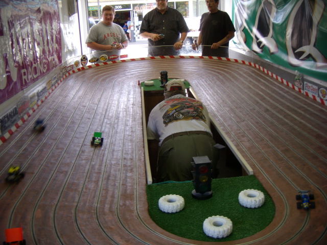 RUMBLE II Big Daddy's Rumble II at Slot Car Raceway (6/30/07) turned into an afternoon of open competition dirt track slot car racing instead of the anticipated road rage follow up to "Rumble I". The star studded list of entrys included 2006 Race of Champion's and 2007 GP Classic wnner, race you anytime anywhere outlaw slot car racer "Big John" Albright, slot car racing Icon and owner of Slot Car Raceway Frank Sarkela, slot car racing legend and VIP Peter V, and The Slot Car Magician, 2006 Race of Champions runner-up Michael Garber. 10 lap heat races set the field for the 30 lap A-Main "Rumble II". After a pair of aborted attempts a single file start got the race going. The first 10 laps saw several lead changes. The three spin rule took effect eliminating several cars as the laps klicked off. Running a low slot it was The Mastermind of Big Daddy's Race Center, Steve Fuller comming up with his second big win since taking the track out on the road last year. FInding the fast groove and squeeking by at the finish ahead of second place finisher Ryan McDaniel and third place finisher Peter V. in the sharp looking Penngrove Motorcycles entry, it was his 10th win on the dirt. Good race guy's!!! Earlier a well known local celebrity was seen hot lapping. How did you like the dirt? Our next race "The King of Calistoga" at Calistoga Speedway is comming up fast. This will be a big event and a must for those race drivers and race fans that are planning to run the second annual "Race of Champions" a week later. The last chance to get ready to take on the Outlaws! We invite evervone to attend both events. This year there will be no entry fee for either event and we are expecting both to be bigger and better than last year!! Special thank's for making this event possible goes to a great slot car racer and VIP, owner of Slot Car Raceway and a great guy too!!, Frank Sarkela. Do yourself a big favor if you have not yet been to Slot Car Raceway and make sure to go and check it out soon. It is a great place to race slot cars and well worth stopping by. |